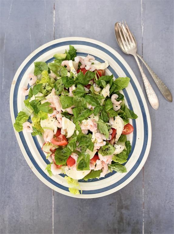 Blandet salat med rejer og mozzarella