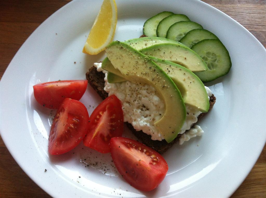 Skær avocadoen i skiver og kom dem oven på hytteosten.